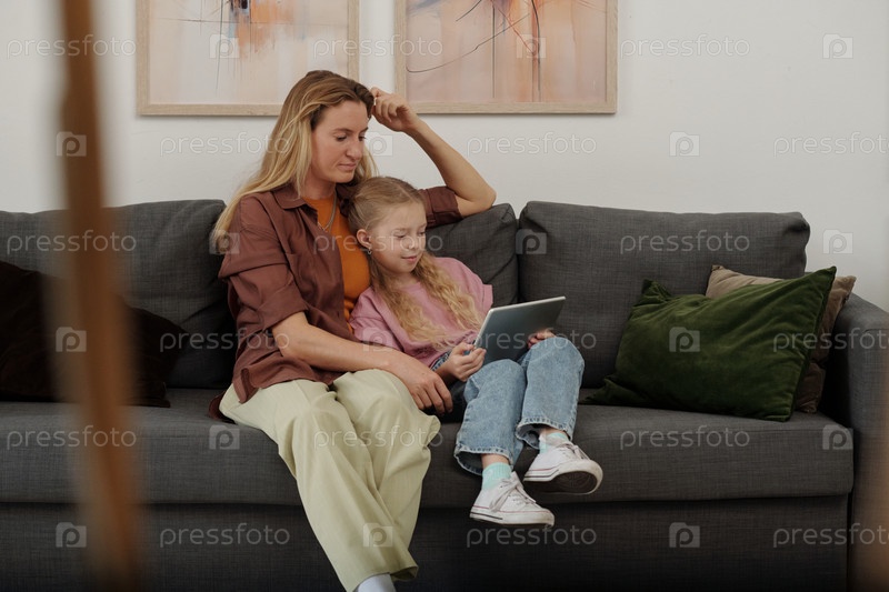 Девушка показывает видео маме, использующей планшет Сидя на диване в домашней обстановке