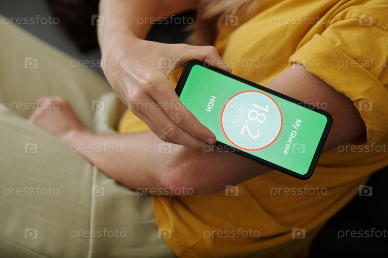 Ближайшее изображение женщины с телефоном, показывающим высокий уровень глюкозы в крови