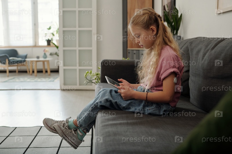 Девушка, сидящая на диване и играющая в мобильную игру