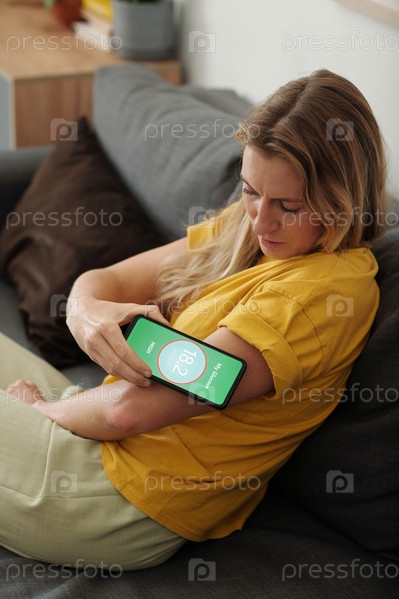 Женщина сидит на диване с телефоном, проверяющим уровень глюкозы