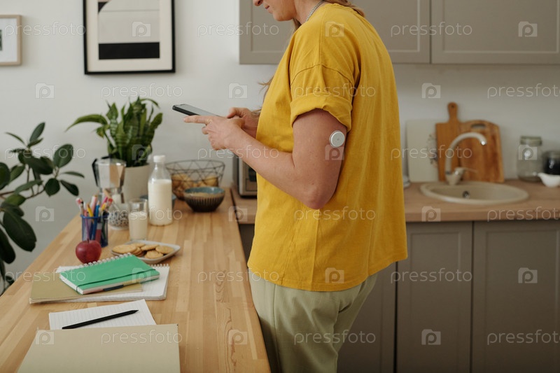 Женщина с диабетом, использующая смартфон на кухне с акцентом на устройство CGM на руке