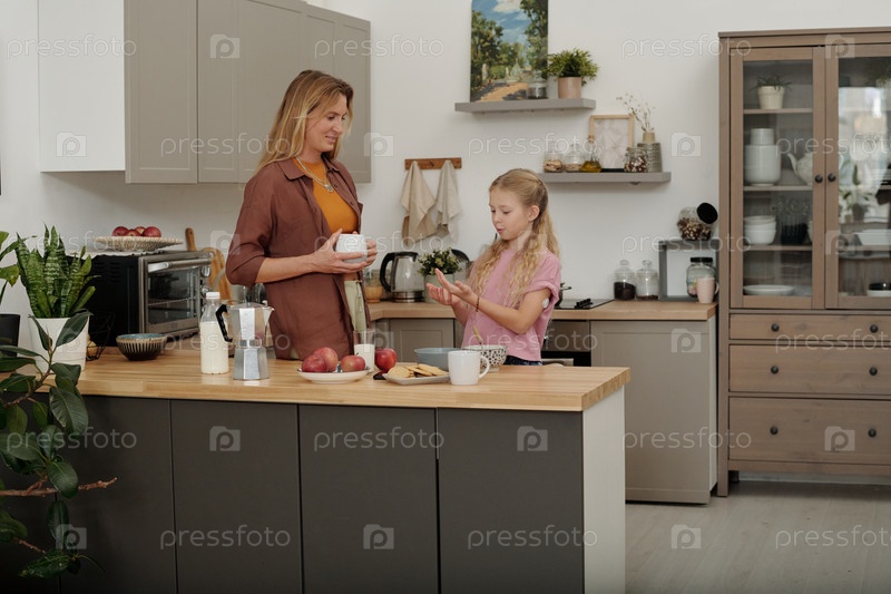 Посмотреть на мать и дочь наслаждаются утром, делая завтрак с видимым