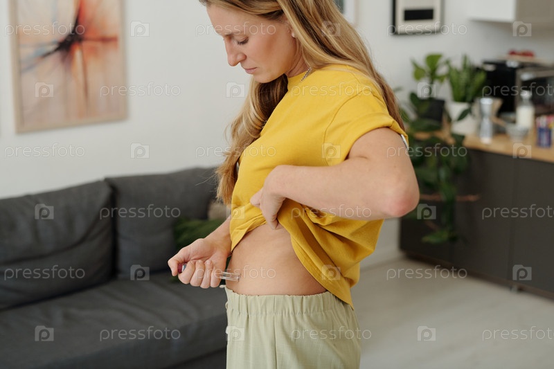 Женщина с диабетом делает себе инъекцию инсулина в животе дома