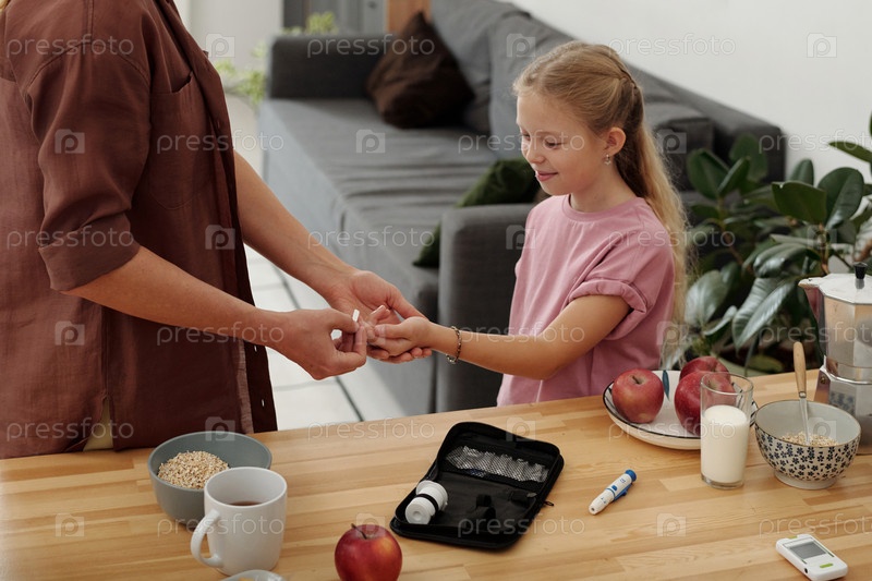 Улыбающаяся девочка с диабетом использует тестовые полоски