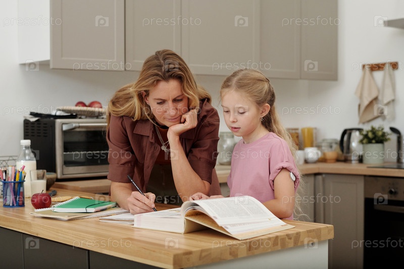 Улыбающаяся мать и дочь на кухне делают домашнее задание