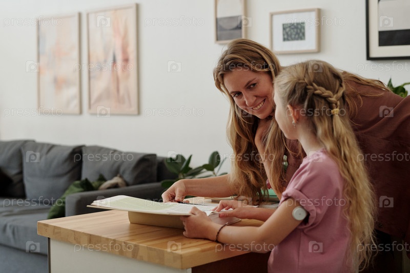 Девочка с датчиком диабета на руке, выполняющая домашнее задание со своей матерью