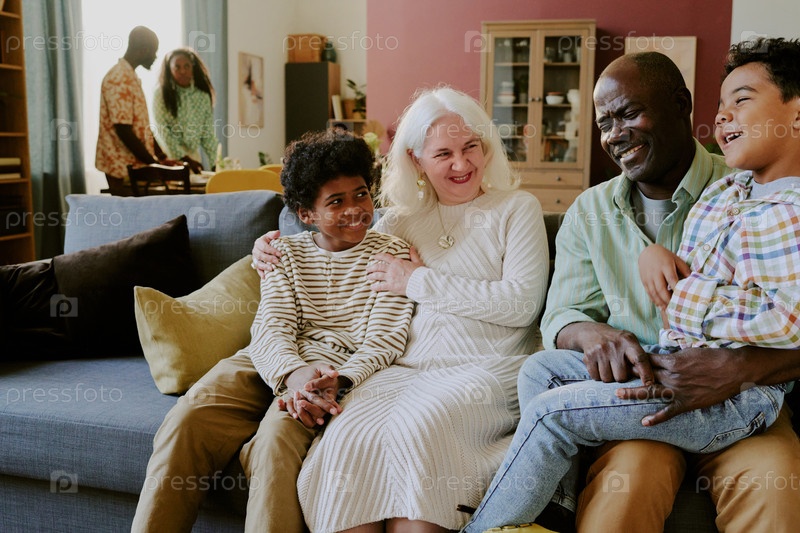 Бабушки и дедушки разговаривают с внуками на диване