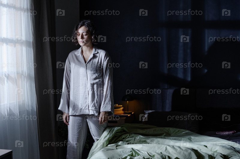 Женщина, страдающая сонным ходьбой, стоит возле окна