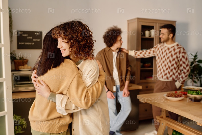 Женщина с кудрявыми волосами улыбается, обнимая своего друга