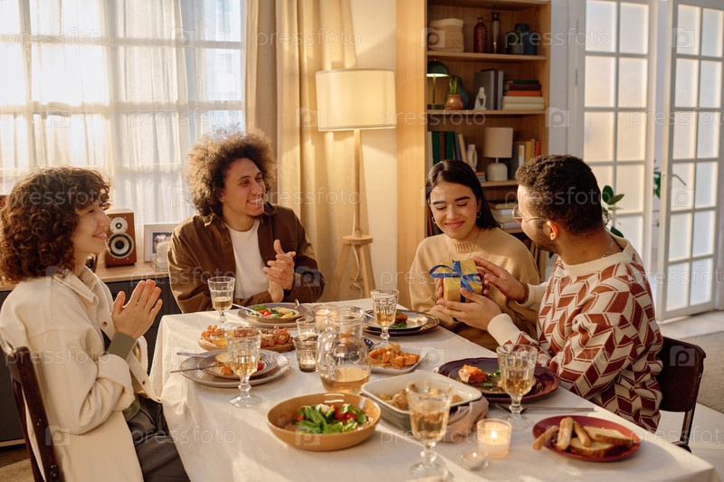 Друзья хлопают в ладоши, пока пара обменивается подарками