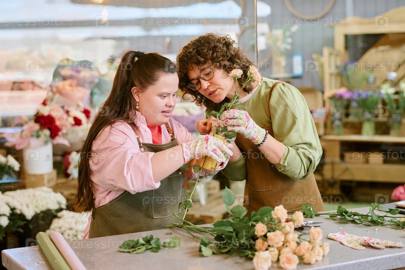 Женщина помогает коллеге по работе с Розой