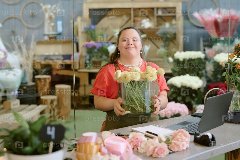 Цветочник держит большую вазу с цветом
