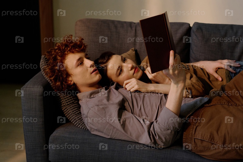 Молодая взрослая пара любителей книг на диване