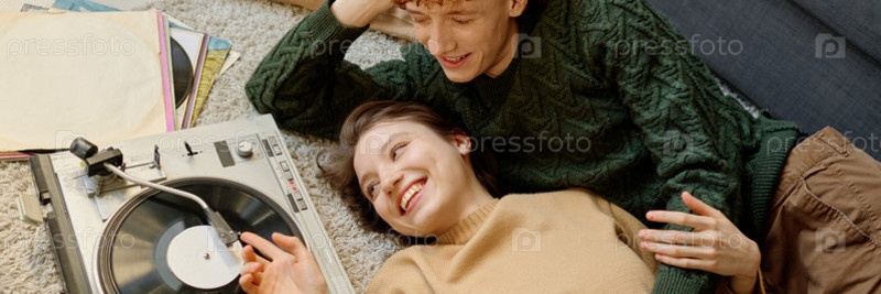 Header with Молодая взрослая пара, лежащая на ковре