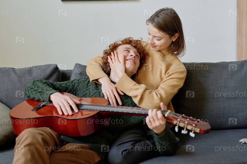 Женщина обнимает любовника после серенады