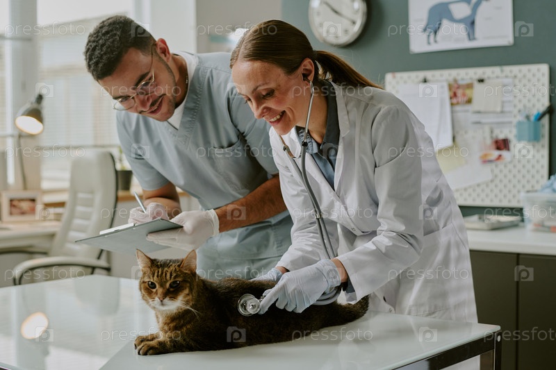 Ветеринары, осматривающие кота с заботливым вниманием