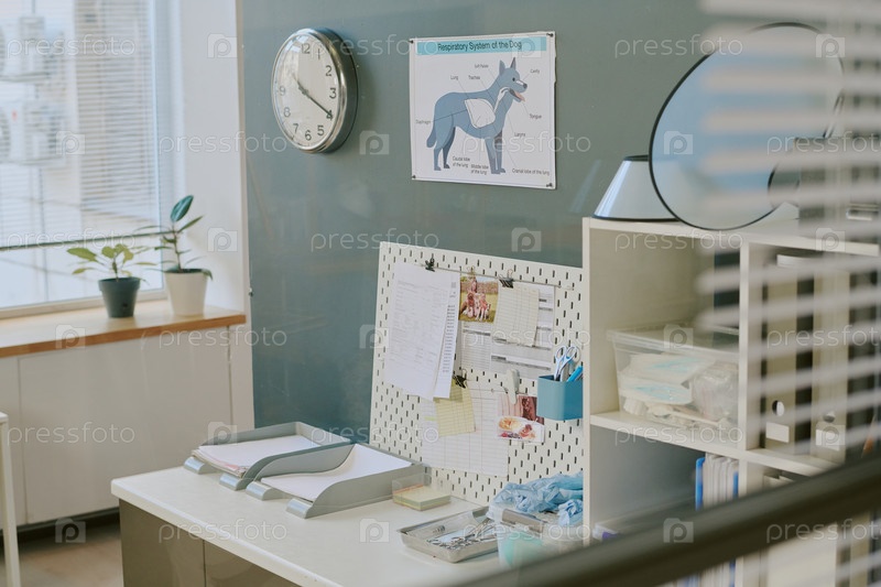 Организованный офисный стол с настенными часами и графическим дисплеем