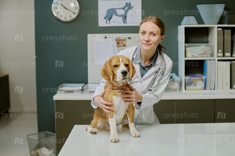 Портрет ветеринара, заботящегося о милом бегле в клинике