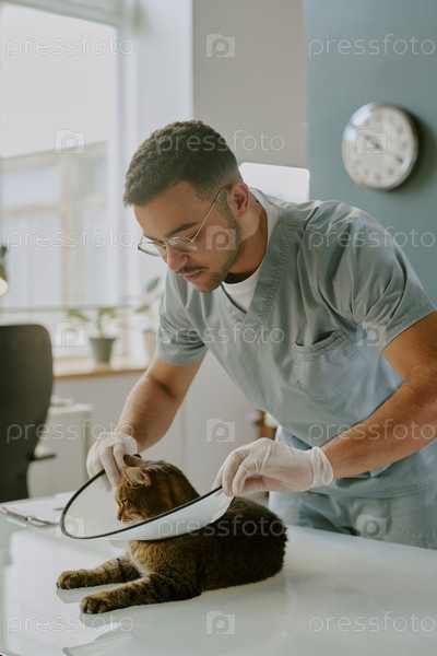 Ветеринар осматривает кота в клинике с помощью стетоскопа