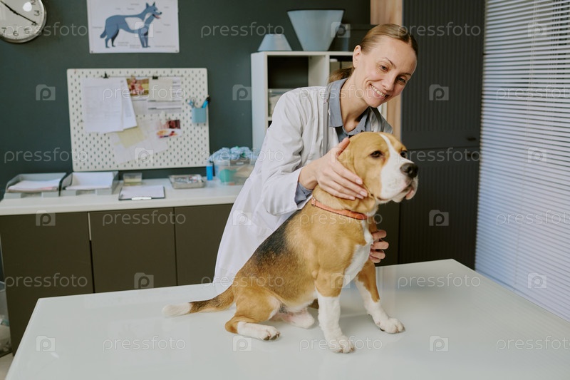Улыбающийся ветеринар осматривает бегла на столе
