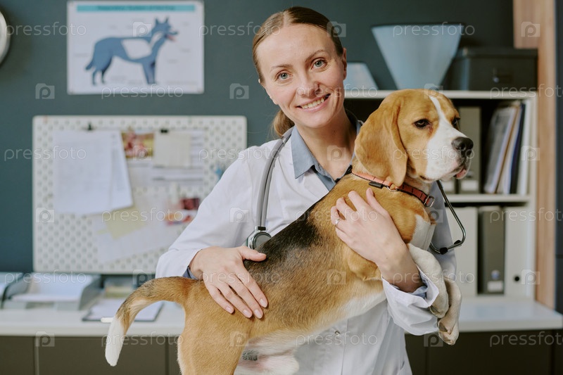 Портрет женщины-ветеринарки, улыбающейся в то время как она держит бегла
