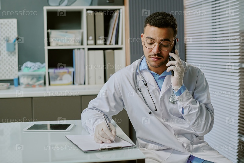 Доктор разговаривает по телефону, держа в руках клипборд
