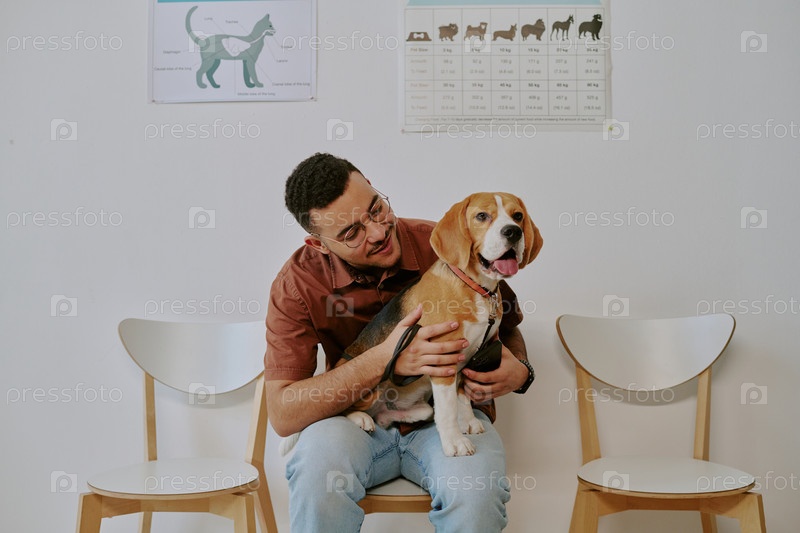 Улыбающийся мужчина сидит с собакой Бигл на коленях