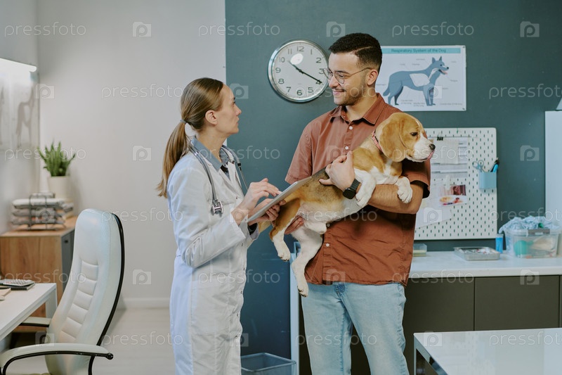 Ветеринар, осматривающий собаку-бигла в ветеринарной клинике