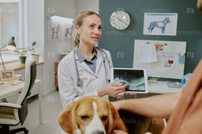 Ветеринар показывает рентген владельцу домашнего животного в офисе