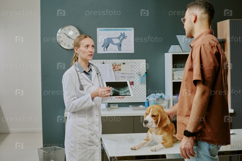 Ветеринар показывает рентген владельцу собаки в комнате для осмотра