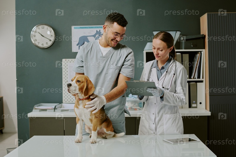 Обсуждение состояния здоровья собаки во время визита к ветеринару