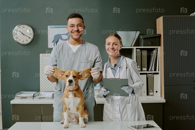 Портрет ветеринара, осматривающего собаку в кабинете клиники