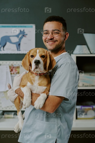 Улыбающийся ветеринар Holding Beagle в ветеринарной клинике