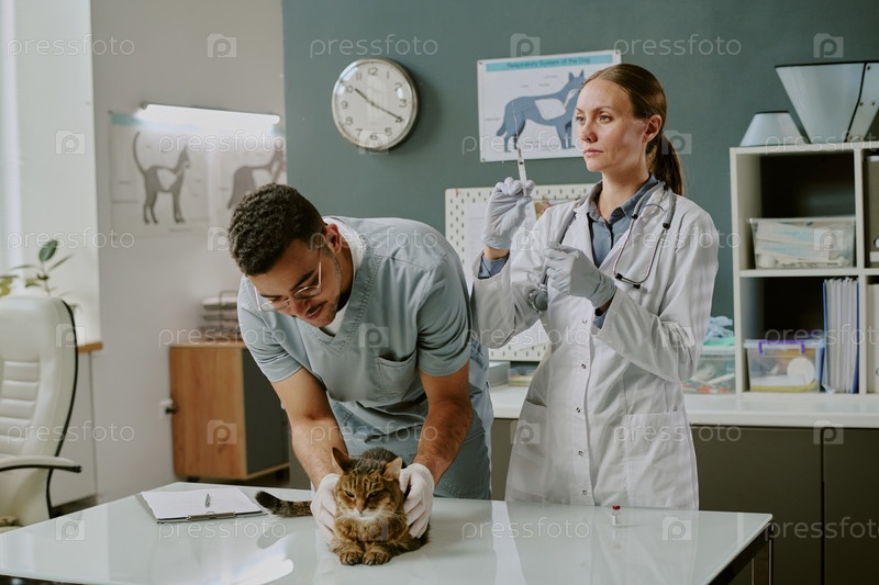 Ветеринары, осматривающие и вводящие инъекции кошке за офисным столом