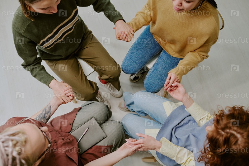 Группа, держащая руки в кругу на полу внутри