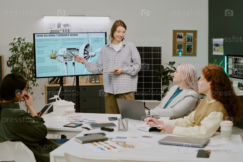 Женщина объясняет ветряные турбины в офисной обстановке