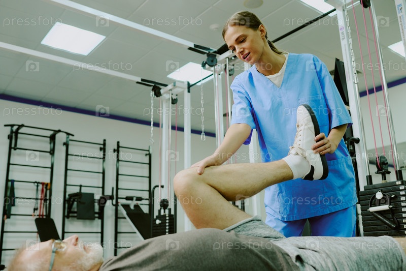Женская тренерка учит пациента растягиваться