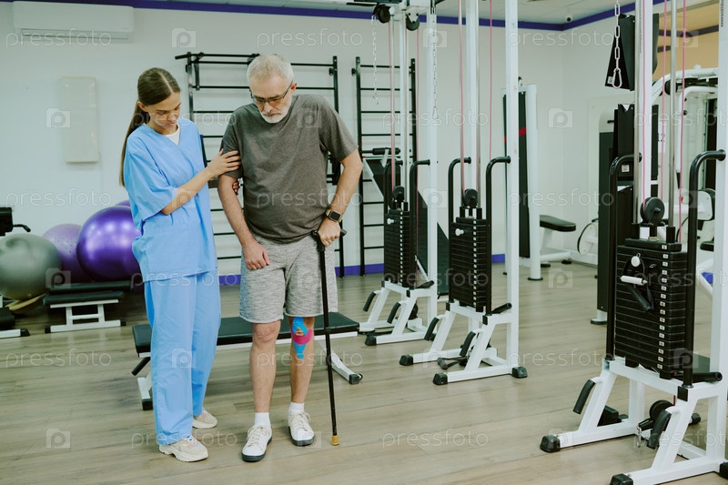 Реабилитационный тренер помогает пациенту ходить
