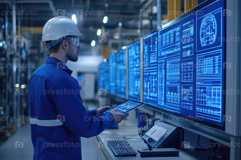 Инженер следит за промышленными системами в комнате управления