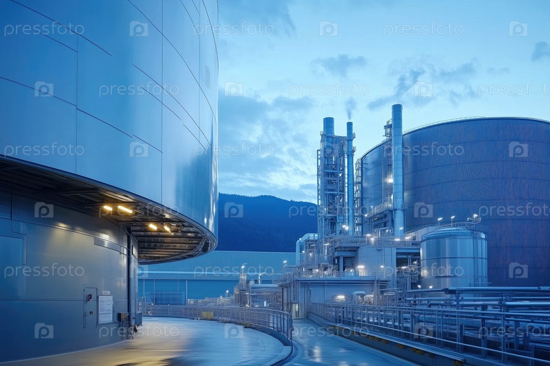 Промышленный объект с видом на горы и облачное небо
