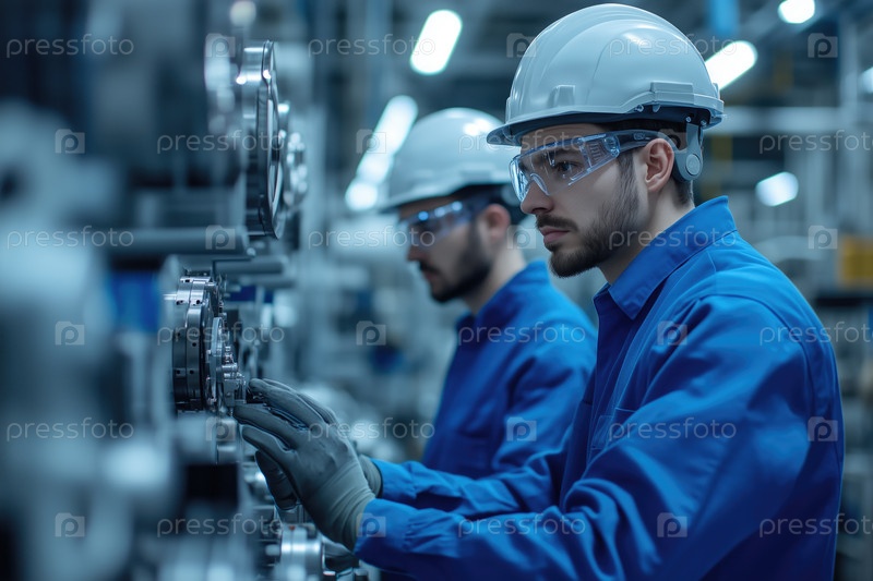 Инженеры, эксплуатирующие передовые машины в заводской обстановке