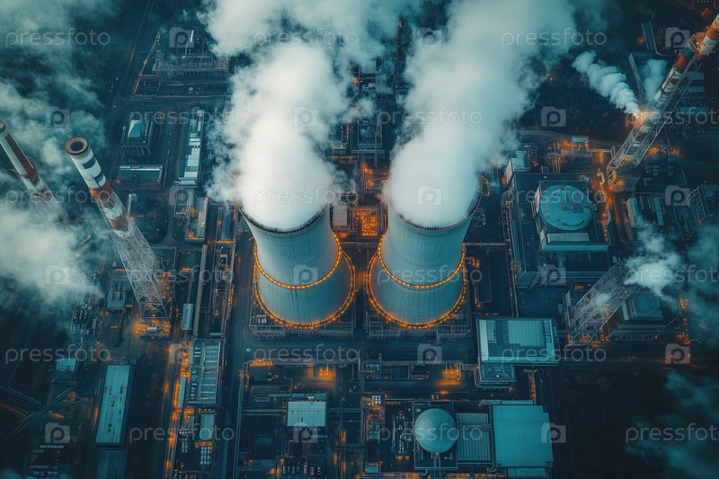 Вид с воздуха на выбросы из промышленного завода в сумерках