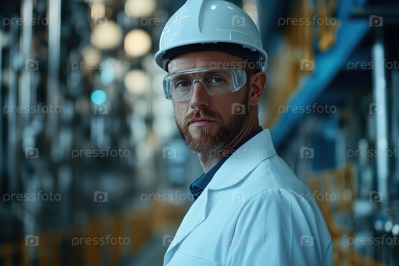 Портрет инженера, носящего твердую шляпу и очки безопасности