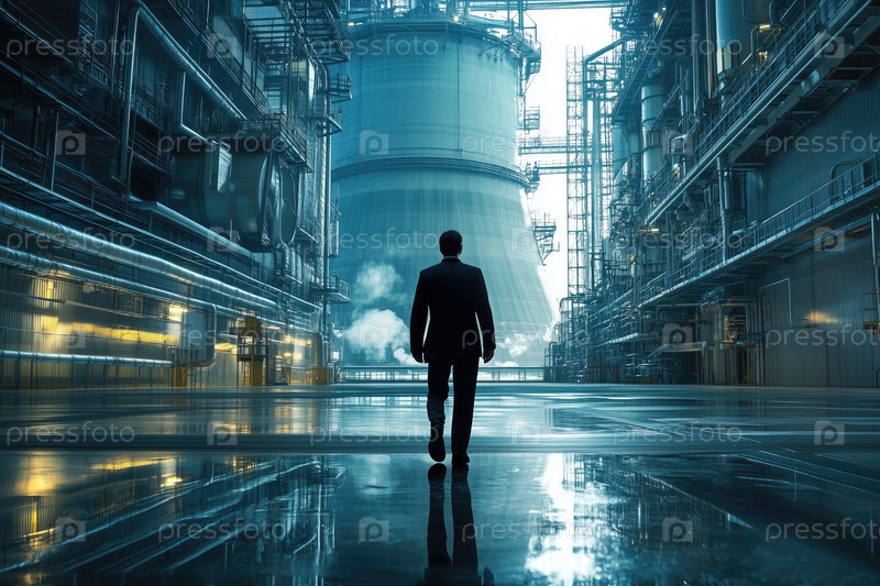 Человек, стоящий в промышленном объекте с высокими потолками