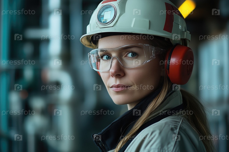 Инженерка-женщина, носящая защитное снаряжение в промышленной среде