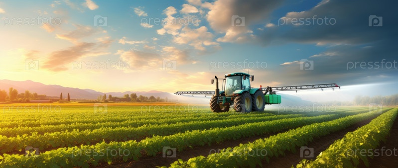 Трактор распыляет пестициды и удобрения на соевых бобах на сельскохозяйственных полях