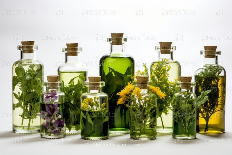 Различные целостные травы в бутылках с маслом в ряд на деревянной доске, светлый фон. Ромашка, календула, базилик травяная ароматерапия