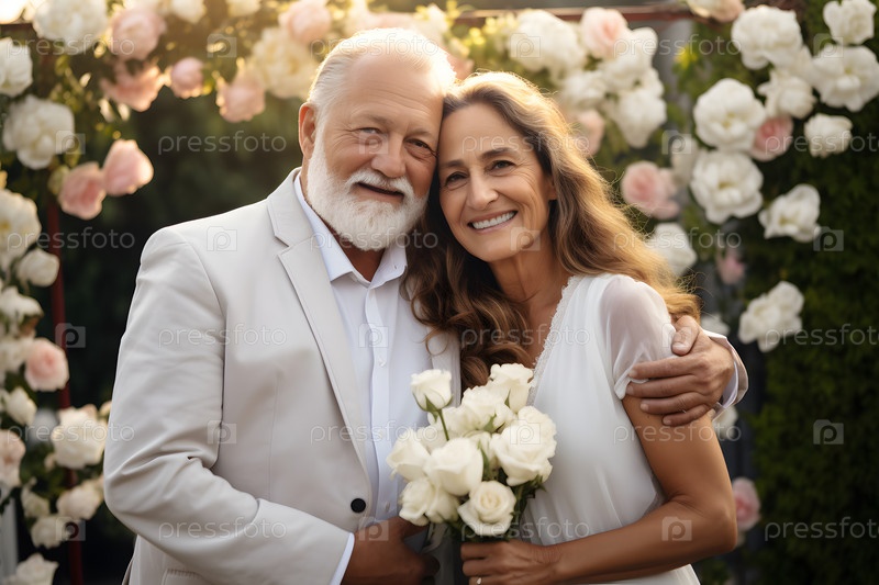 Пожилая пара, невеста и жених в цветущем саду, праздничная свадебная атмосфера