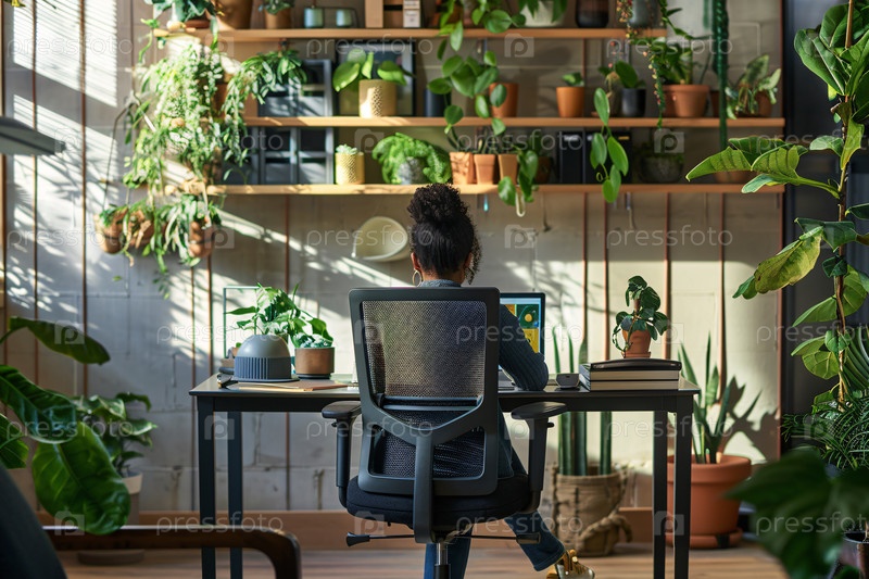 Современный домашний офис с естественным освещением и обилием зелени