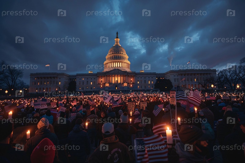 Толпа людей с американскими флагами и факелами собирается перед зданием Капитолия США в сумерках, демонстрируя гражданское единство и патриотизм